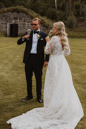 Brudparet hade planerat den bästa tänkbara entrén till minglet, via helikopter! När vi hade fotat klart porträtten gick vi till vår chaufför, fick åka en liten rundtur och sen landade vi på gården där alla gäster stod och väntade. Superkul att jag fick åka med också och stämningen var ju bara helt på topp när brudparet klev ut ur helikoptern och välkomnades av alla gäster.