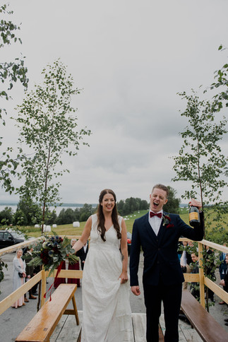 ↠ Då det var lite för långt för att gå mellan vigseln och festen hade vi ordnat med gemensam skjuts för alla gäster som inte hade bil. Markus pappa körde traktor med ett jättestort släp som han byggt ett räcke på, ställt upp långa bänkar och pyntat med björkris. Så kul grej och när vi åkte den korta biten på motorvägen bildades ett långt tåg med bilar bakom oss, verkligen minnesvärt!