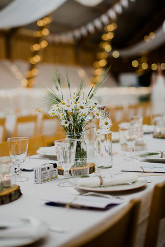 ↠ Vi plockade blommor i naturen som vi dekorerade borden med, både miljövänligt, fint och säsongs-enligt. Dessutom passade det fint med vårt lantliga tema på bröllopet!